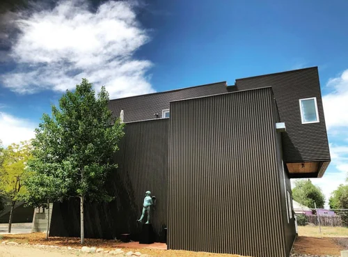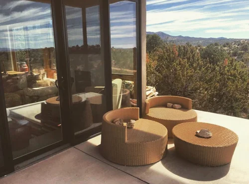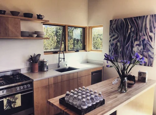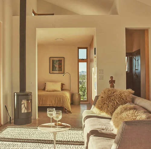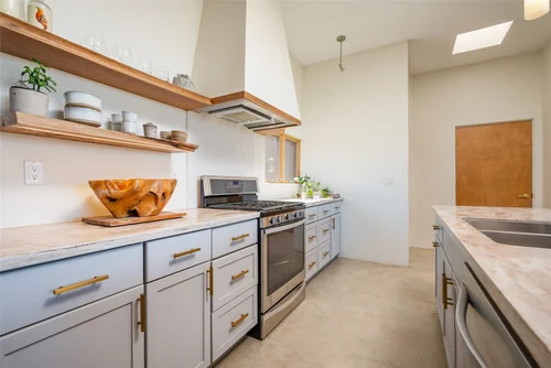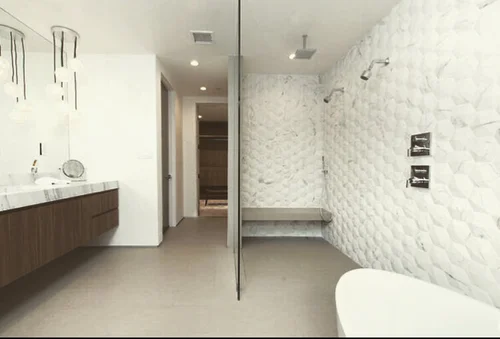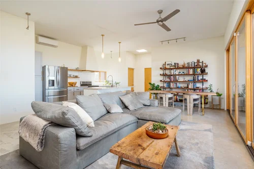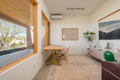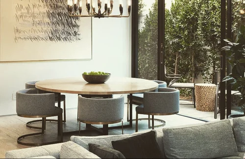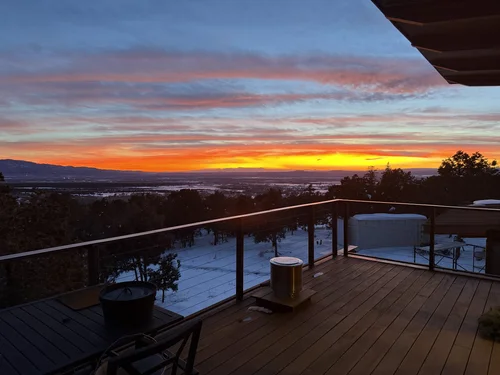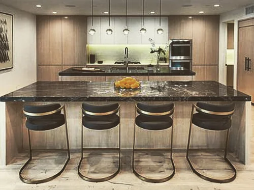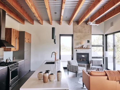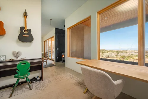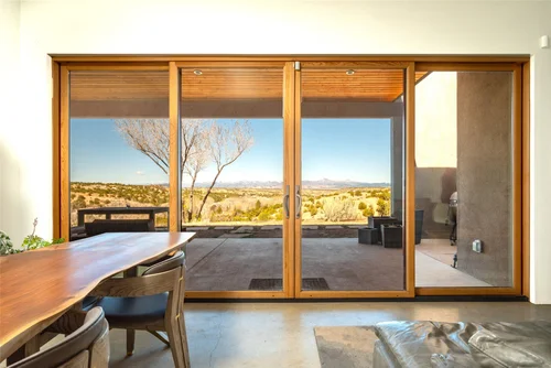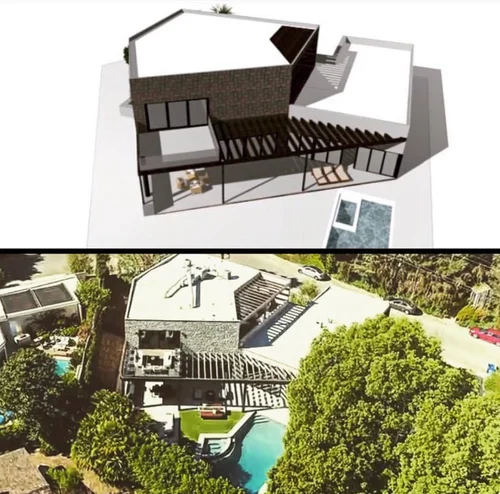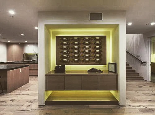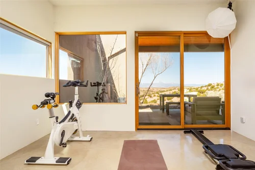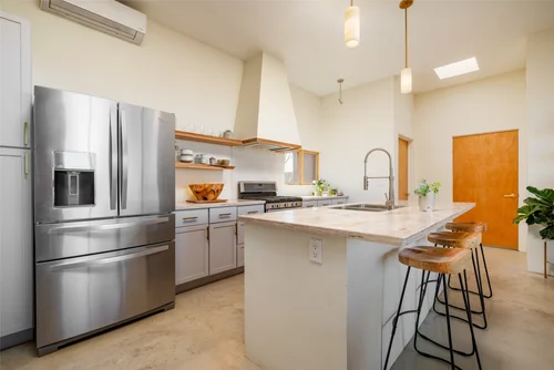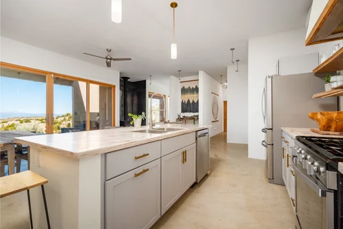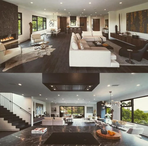 Atop the summit of Mount Olympus soars this stunning architectural tour de force, an entertainer’s paradise with breathtaking views of the City lights below. Walking through the private gates, you are immediately awestruck by the exceptional artisanal details of this contemporary estate: from the chiseled stone canopy, to the 20 foot vertical sculptural light, to the 10 foot oak door with matte black steel handle. As you ascend the glass and European oak staircase, the expansive great room welcomes you with 12’ high ceilings, lavish light and air, floor to ceiling windows, and views from Downtown LA to Palos Verdes. The sleek professional Miele kitchen with leathered granite island, custom oak cabinetry, downdraft hood, induction cooktop, abundant island seating, and dual dishwashers make this one of a kind kitchen the dream place to dine and entertain. Step out to a rich pebble deck that accentuates the unrestrained spaciousness of the interiors, and the indoor outdoor feeling of this quintessential contemporary home. For more elaborate full scale dinners, continue to the formal dining area, complete with a stunning signature three sided fireplace and architectural designer lighting.